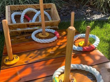 Ringtoss is 1200 long & 600 wide. Playing area needed is 5 metres; move timber posts to add difficulty.